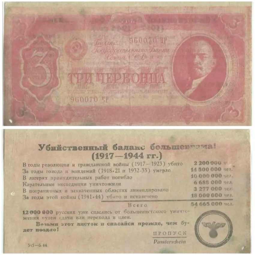 Ещё одна листовка из той же серии, только номинал уже «Три червонца». Работала как пропуск в плен. В дополнение написана пропаганда против большевизма