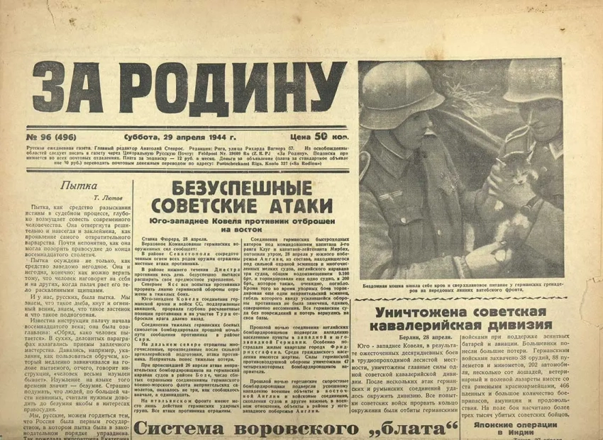 Выпуск немецкой газеты «За Родину», распространяемой на оккупированных территориях СССР. Подобные газеты имели задачу «обличать» преступления советского режима и создавать образ непобедимых «немцев-освободителей». Например, на главной картинке этого выпуска газеты немцы якобы заботятся о бездомной кошке, даже такие мелочи должны были создавать соответствующий образ немецких солдат.
