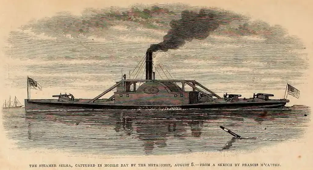 • «Сельма» — перестроенная из коммерческого парохода и частично бронированная колесная канонерская лодка водоизмещением в 590 тонн. Вооружение: три гладкоствольных тяжелых орудия и одно 163-мм нарезное орудие Брука. Скорость её была выше скорости броненосца и составляла 9 узлов.