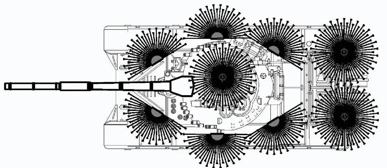 Одним из новых веяний в деле защиты бронетехники оказались гибкие элементы – тросы, канаты и даже простая проволока, свисающая навстречу боеприпасу. Элементы ограничивают вращение башни и наведение орудия. В одном из патентов 2025 года предлагается идея упрощенного крепления пучка пик, образующих лучеобразную полусферическую форму. Снаружи это выглядит очень экзотически, но, по мнению автора, является «полезной моделью, относящейся к средствам защиты объектов от разрушающего действия БПЛА разного назначения, в частности к средствам защиты автомобильной техники гражданского и специального военного назначения (санитарной, ремонтной, транспортной), морских надводных дронов от боевых средств противника, а также для защиты стационарных объектов – зданий и сооружений, вышек и мачт, фортификационных сооружений, ограждений и т.д.». Пучки пик на защищаемом объекте позволяют отбрасывать приближающиеся дроны, а также их боевые части – гранаты и мины. Если точнее: