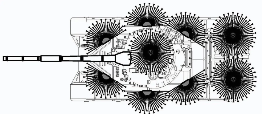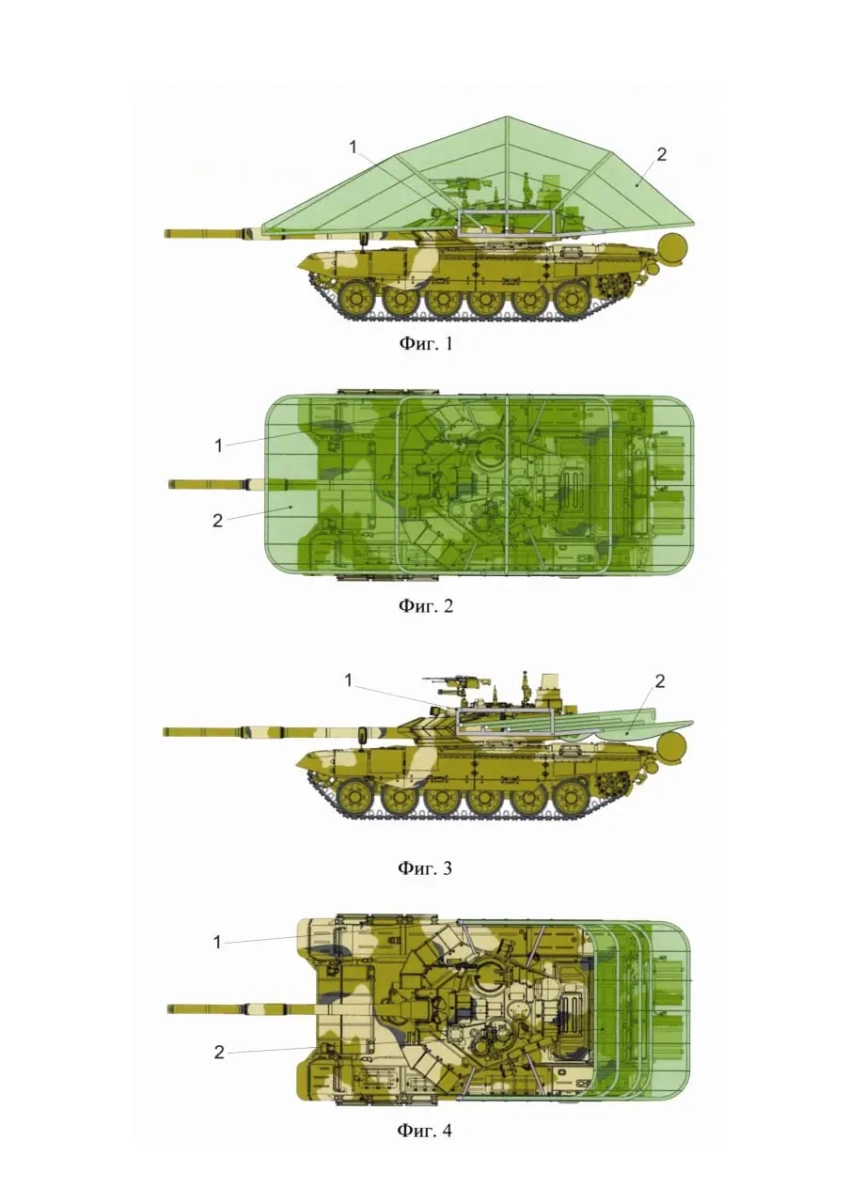 В походном положении экипажу ничего не мешает – небо над танком свободное. В боевом на верхнюю полусферу накидывается капюшон, заметно усложняющий атаку FPV. При этом машина может вращать пушкой на 360 градусов – так как вся оснастка закреплена на башне. Решение недорогое и интересное. Осталось только дождаться в войсках. К слову, патент датируется сентябрем прошлого года.