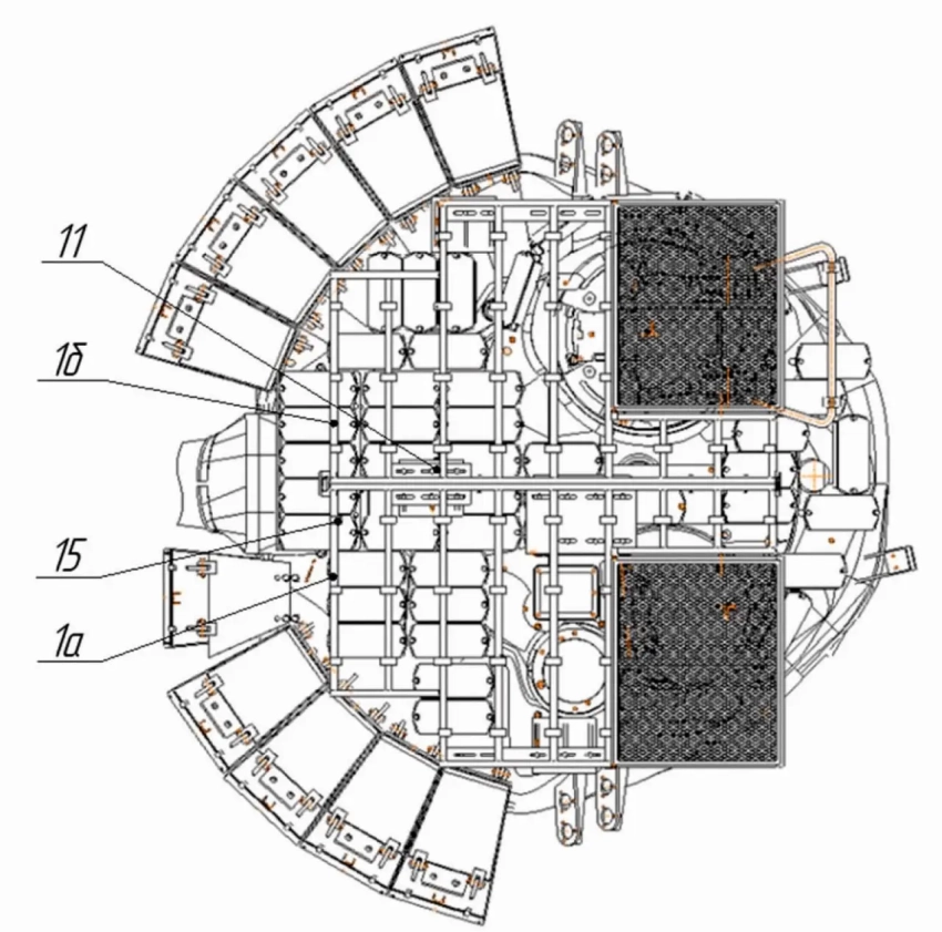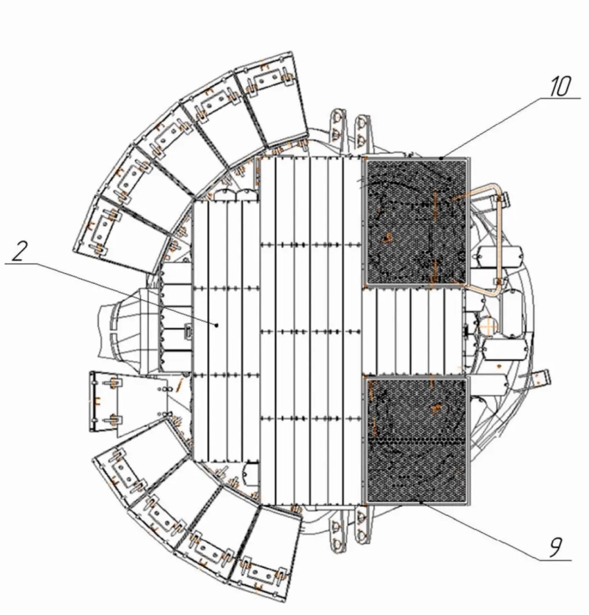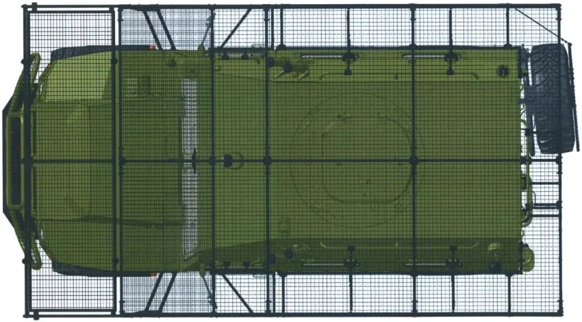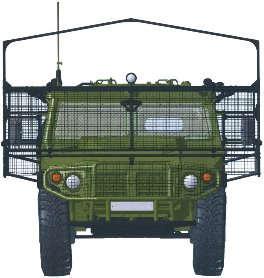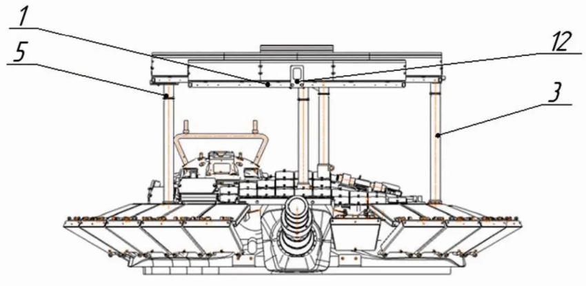 Вернемся к разработкам инженерной академии имени Карбышева. Точнее, к патенту RU2843238C1, подозрительно напоминающему по своему содержанию одно зарубежное антидроновое решение. Не будем указывать откуда, грамотный читатель сам все поймет. Внешне изделие напоминает складную крышу кабриолета, за исключением того, что верх у него не мягкий, а собран из стальной сетки.