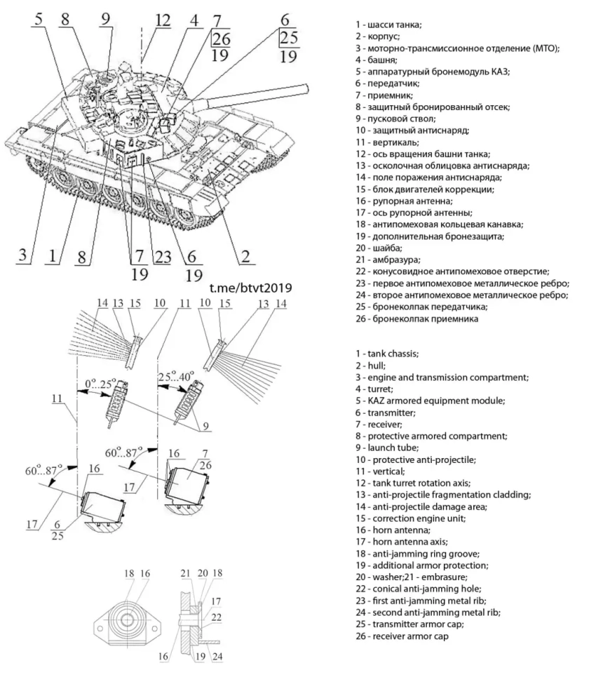 Гораздо сложнее выглядит разработка Конструкторского бюро машиностроения – усовершенствованная КАЗ «Арена-М». Ориентация стволов по азимуту обеспечивает всестороннюю защиту комплекса активной защиты, позволяя направлять противоракеты в процессе полета. Для защиты верхней полусферы некоторые пусковые стволы КАЗ размещены под углом от 0° до 25° относительно вертикали, причем их осколочные элементы ориентированы в сторону горизонта или верхней полусферы. Антенны приемников и передатчиков установлены с наклоном от 60° до 87° к вертикальной оси. Что ж, ждем на фронте. Подобные изделия необходимы как воздух.