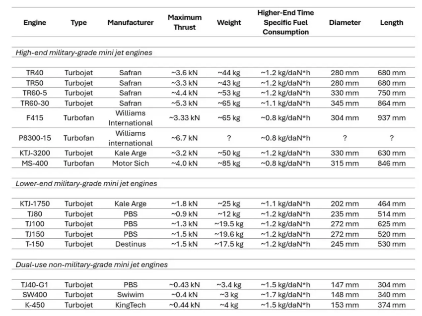 В-третьих, существуют двигатели невоенного назначения со сравнительно ограниченной мощностью, которые, тем не менее, используются на Украине для оснащения крылатых миниракет. Они имеют ограниченную полезную нагрузку и дальность полёта, неэффективны в плане расхода топлива и, как правило, менее надёжны при длительных и высоких нагрузках, например, при продолжительных или маловысотных полётах, а также хуже переносят высокие температуры, вибрацию и пыль. Однако они весьма доступны, имея цену обычно ниже $10 тыс.