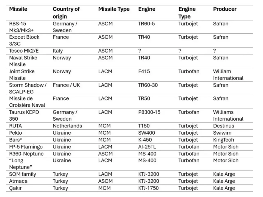 Как отмечается в издании, европейские программы создания КР в настоящее время опираются на четырех основных производителей двигателей: Safran (Франция), «Мотор Сич» (Украина), Kale Arge (Турция) и Williams International (США).