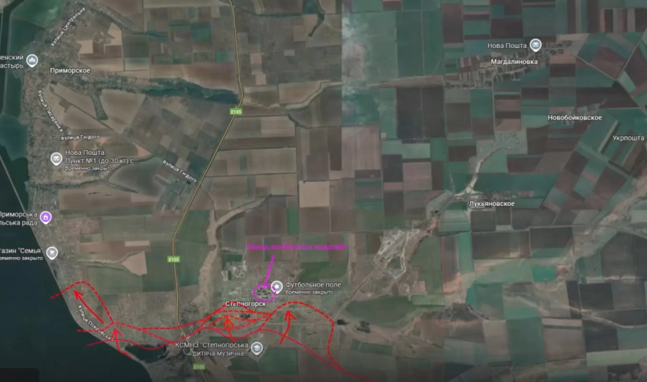 Западнее, в районе Степногорска и Приморска, продолжается встречное сражение. Российские части успешно штурмуют Приморское и глубоко в нем продвинулись.