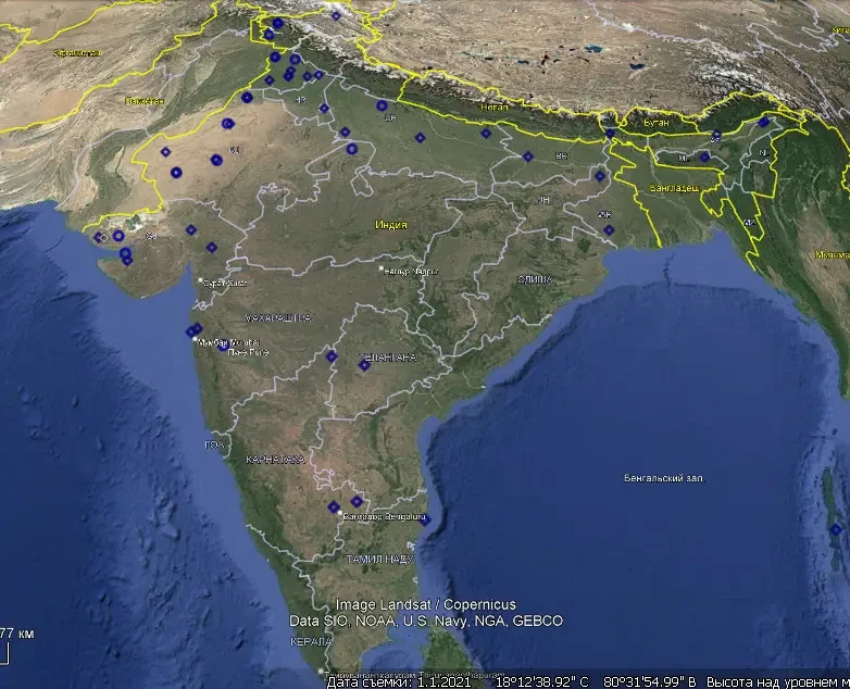 Схема расположения на территории Индии радиолокационных постов по состоянию на 2020 год