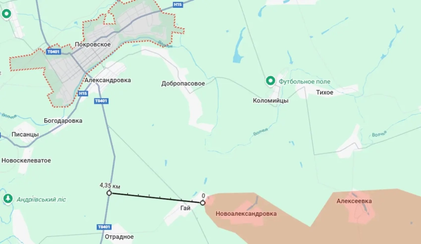 Одновременно с этим уменьшено расстояние до автомобильной дороги Т0401, которая соединяет Покровское с городом Гуляйполе, что в Запорожской области. Такое расстояние (около 4 км) позволяет взять участок этой дороги к западу от села Гай под огневой контроль. Работают по нему FPV-дроны, удары наносят миномётные расчёты ВС РФ.