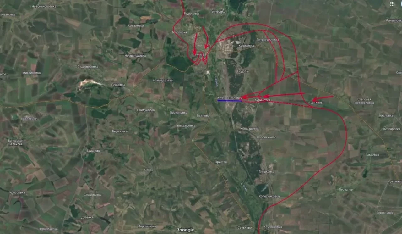 У противника большие проблемы и на Купянском направлении. Российские войска сумели рассечь группировку ВСУ на левом (восточном) берегу реки Оскол и вышли на окраины Купянска-Узлового, вызвав полную дезорганизацию обороны.