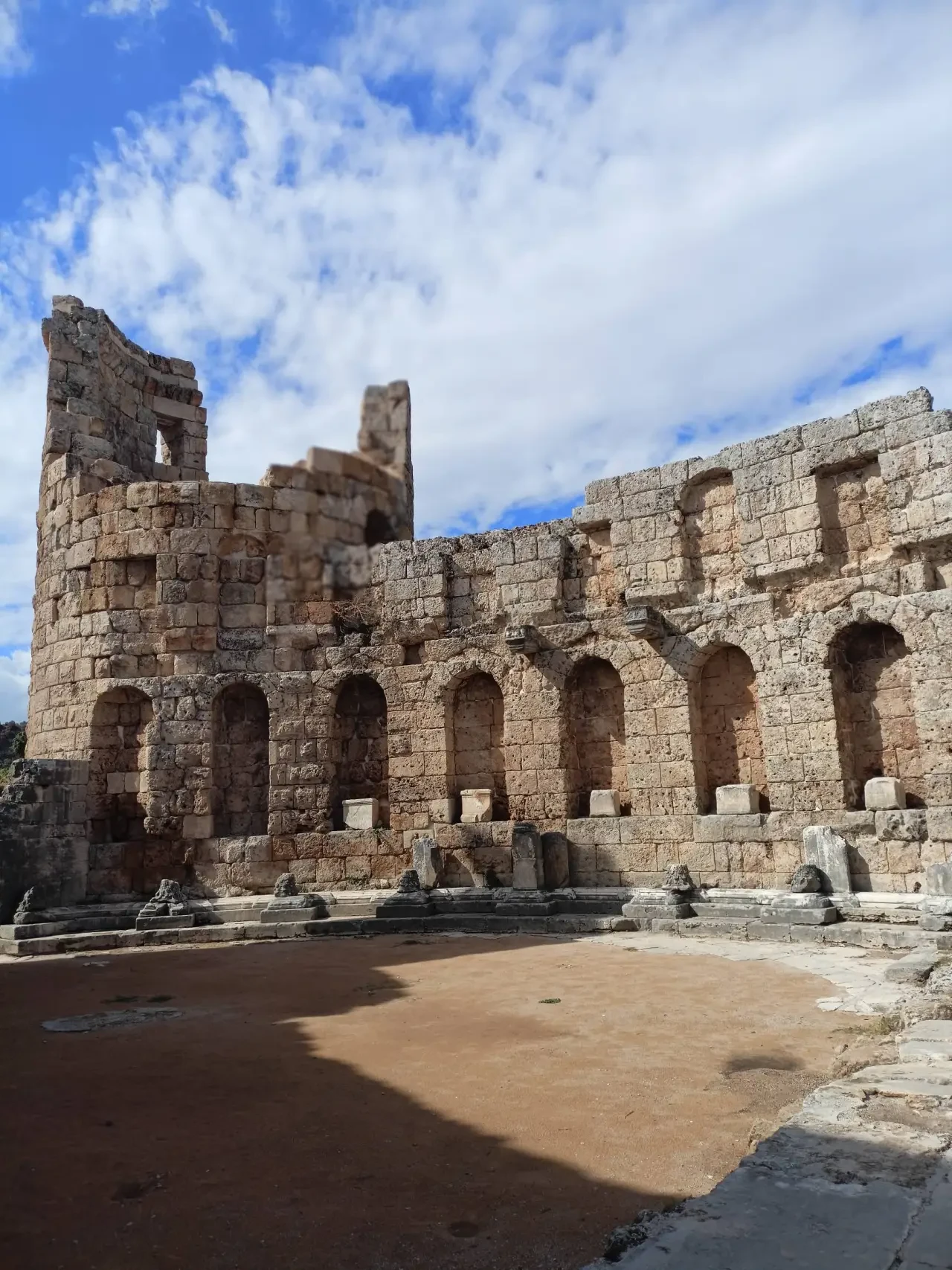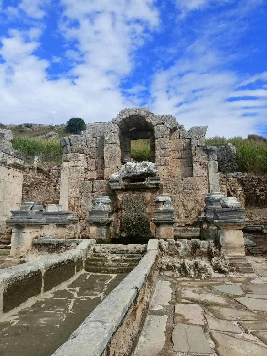 Поскольку город стоял на реке, его центральная улица заканчивалась «нимфеем», построенным в эпоху императора Адриана. Это было святилище, посвящённое нимфам. Обычно они сооружались у источника воды или водоёма. За нимфеем Перге начинается подъём на холм, где располагался акрополь. Вот только его сооружения сохранились плохо.