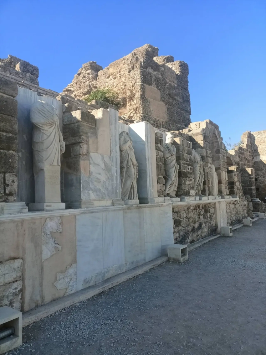 Интересных памятников древности в городе много. Это и храм Аполлона, от которого сохранилось несколько колонн. И городская крепостная стена с зубцами и внутренними арками. Раскопали римский театр, вмещавший более 20 тысяч зрителей. Кстати, самый большой римский театр на территории Турции. Была очищена и главная улица города, которая проведет вас по всему полуострову до самого западного его конца.