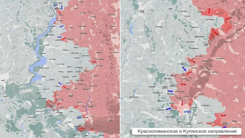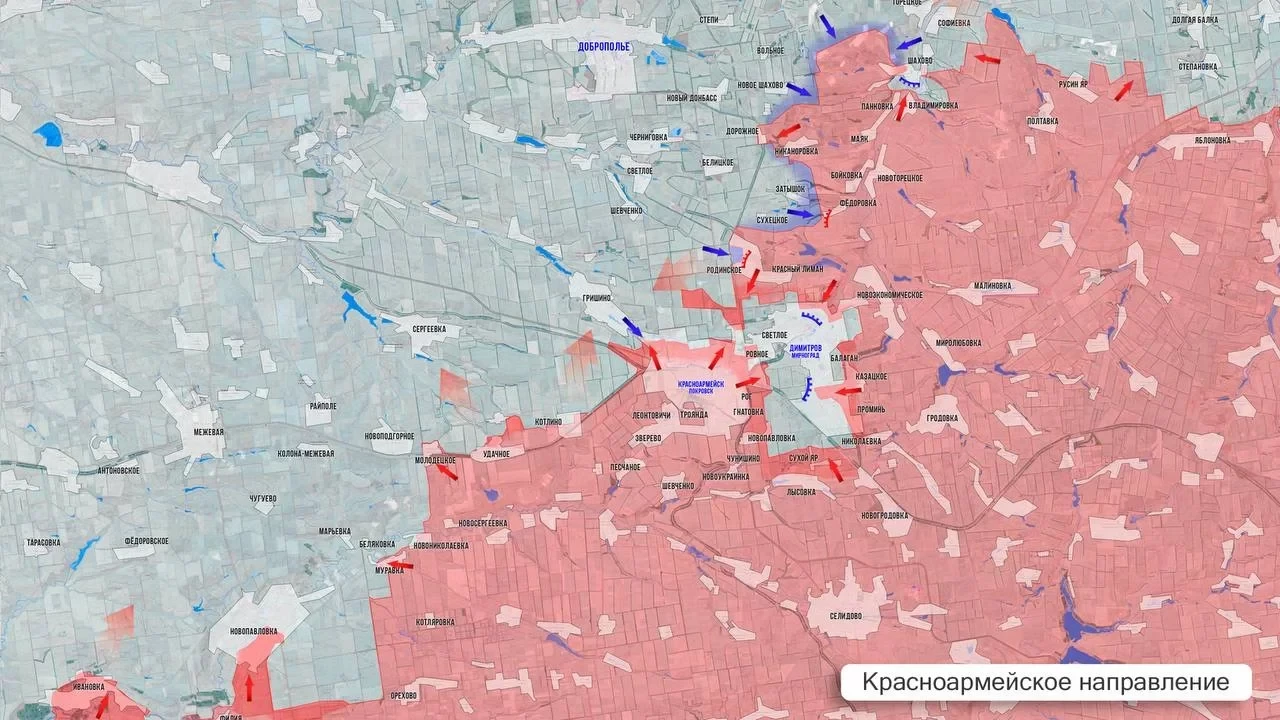 Российские штурмовые группы пробились в сам город Красный Лиман на двух участках юго-восточной окраины, где сейчас идут ожесточенные встречные бои. Севернее наши бойцы вышли на южные окраины Богуславки, где в этот раз удалось закрепиться в жилой застройке, создав плацдарм для дальнейшего штурма. Противник пытается контратаковать в Загрызово.