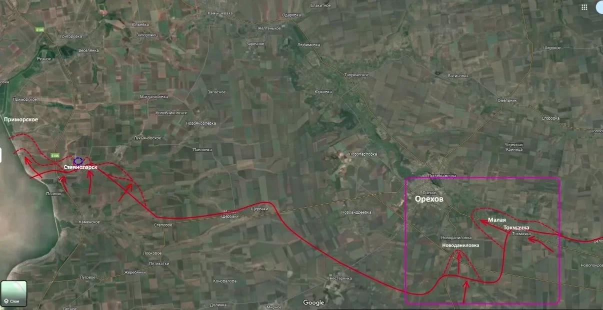 В данный момент идет работа по расширению плацдарма для соединения с частями, совершившими прорыв в районе Малой Токмачки. Главная тактическая задача - ликвидация «кармана» между этими выступами, что позволит подтянуть расчеты БПЛА и начать непосредственные городские бои в Орехове.