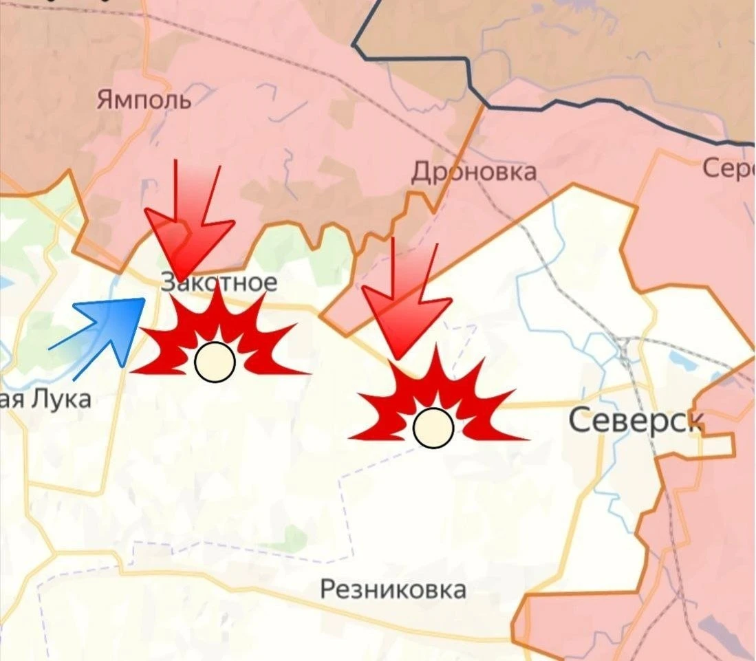 Также ВС РФ продвинулись в районе Закотного, начались бои за сам населённый пункт. Противник атакует со стороны Ильичевки (Озерное) для недопущения блокировки своих подразделений, оставшихся между Ямполем и рекой Северский Донец. Со стороны Платоновки наши подразделения продвинулись в отвершке балки в направлении трассы Т-05-13.