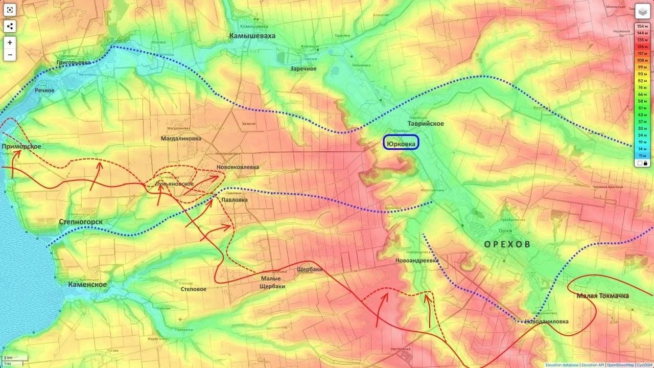 Развитие наступления идет как севернее, так и южнее линии обороны, с общим вектором движения в сторону Юрковки. Закрепление на этом рубеже критически важно для будущей операции по Орехову: контроль над высотами даст преимущество в применении беспилотников и позволит перерезать пути снабжения местной группировки ВСУ, что в перспективе может привести к взятию города и дальнейшему продвижению в направлении Запорожья.
