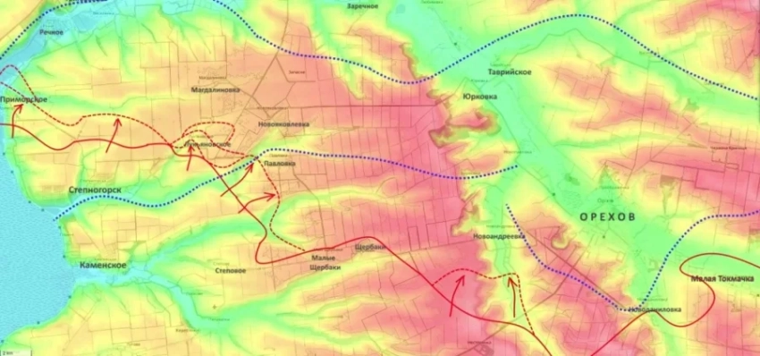 Активные действия фиксируются и на южном фланге. На Запорожском направлении подразделения группировки войск «Днепр» провели тактический манёвр западнее Орехова. Речь идёт о прорыве первой линии обороны и развитии наступления южнее Степногорска, что создаёт угрозу Ореховскому укрепрайону с юго-западного направления.