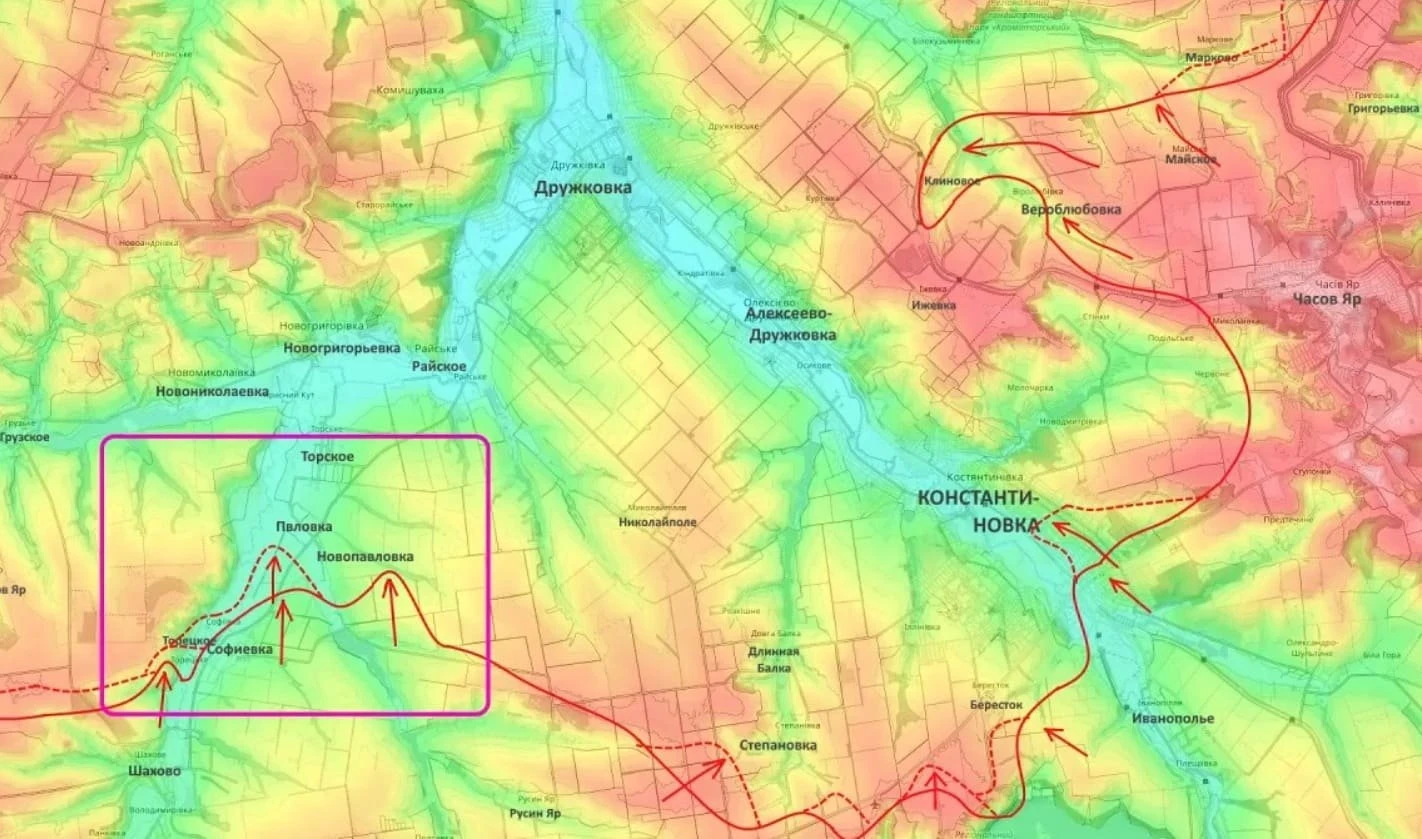 В свою очередь на Константиновском направлении фиксируется значительное продвижение. ВС РФ расширяют плацдарм севернее Константиновки (в районе Веролюбовки и Майского), а также заняли южную часть Марково.