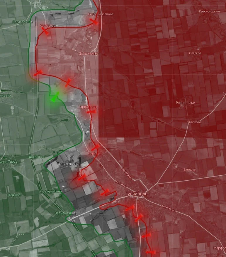 На Гуляйпольском направлении ВС РФ расширяют плацдарм западнее р. Гайчур. Прилуки и Еленоконстантиновку наши войска обошли с запада и фактически противник оказался в оперативном окружении. Со стороны Еленоконстантиновки наши части начали продвигаться в сторону Цветкового. За сутки ВС РФ отбили 4 контратаки ВСУ в районе Гуляйполя и 4 - у Косовцево. Выше по карте противник навязывает встречные бои в районе Братского. Идут бои в направлении Христофоровки и Терноватого с севера.