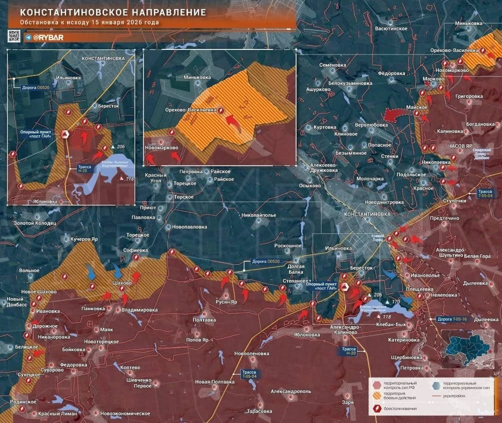 Красноармейское направление после освобождения города Красноармейска всё ещё отличается повышенной интенсивностью боевых действий. Бойцы Вооружённых сил Российской Федерации (ВС РФ) постепенно продвигаются и регулярно освобождают новые территории в Донецкой Народной Республике (ДНР). Свежие новости из зоны СВО, карта боевых действий, сводка боевых действий на пятницу, 16 января 2026 года, - в материале нашего сайта echonedeli.ru.
