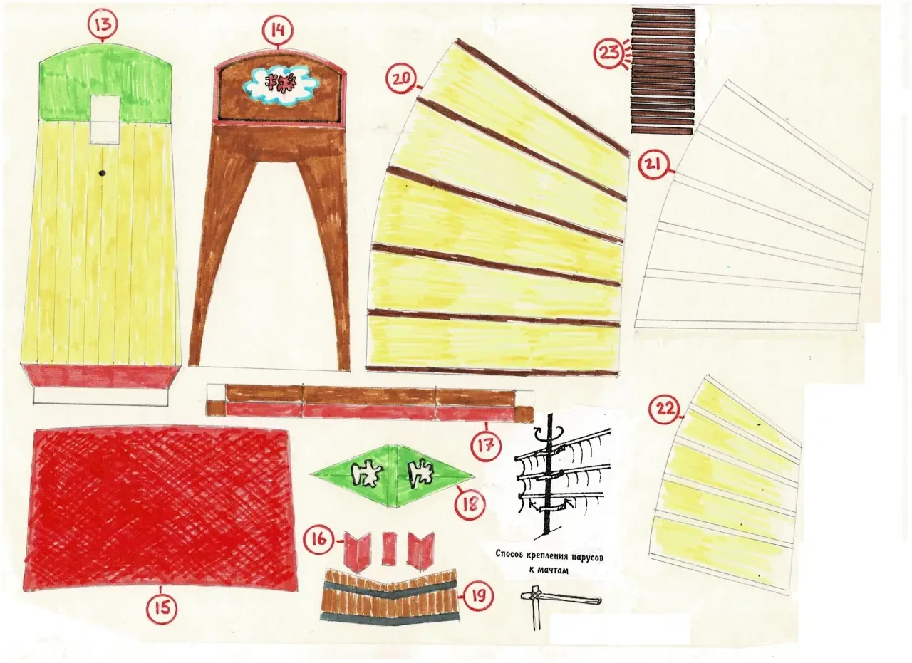 На нашей модели эти «латы» выполнены из реек шириной 2 мм фирмы «АВ-модель», но можно точно так же вырезать их из бумаги. На мачту парус «надевается» с помощью таких же полосок (или реек), которые выгибаются и приклеиваются к латам так, чтобы под них можно было бы просунуть мачту. Длина таких полосок из реек должна быть не меньше 30 мм, иначе они будут ломаться, а вот если они бумажные, то размеров деталей 23 для того, чтобы закрепить паруса на мачтах, будет вполне достаточно.