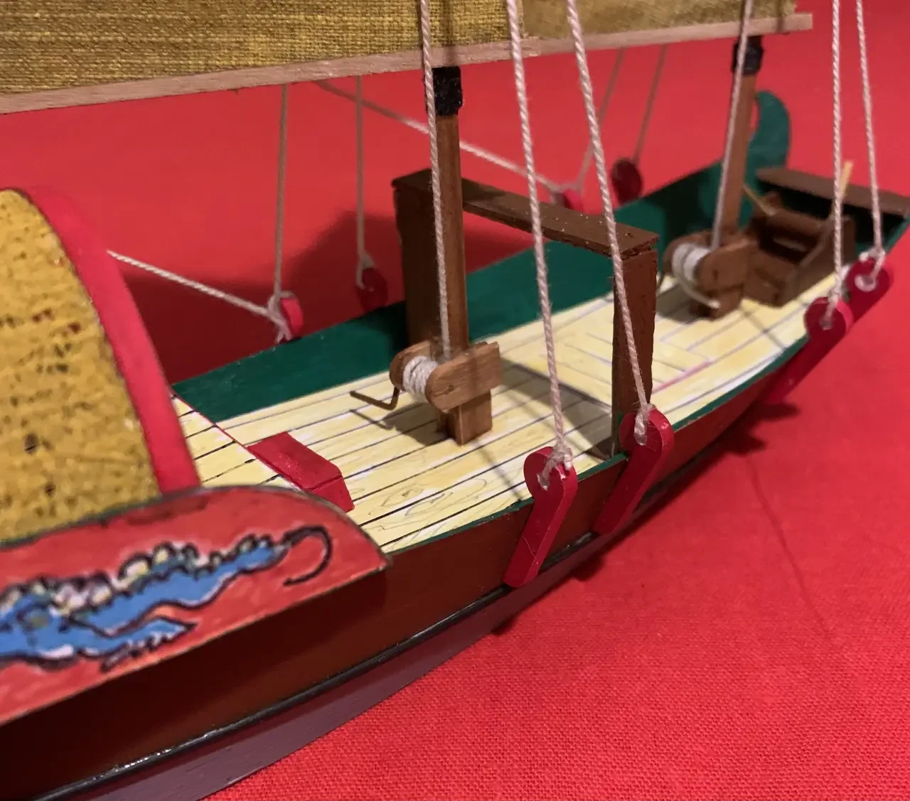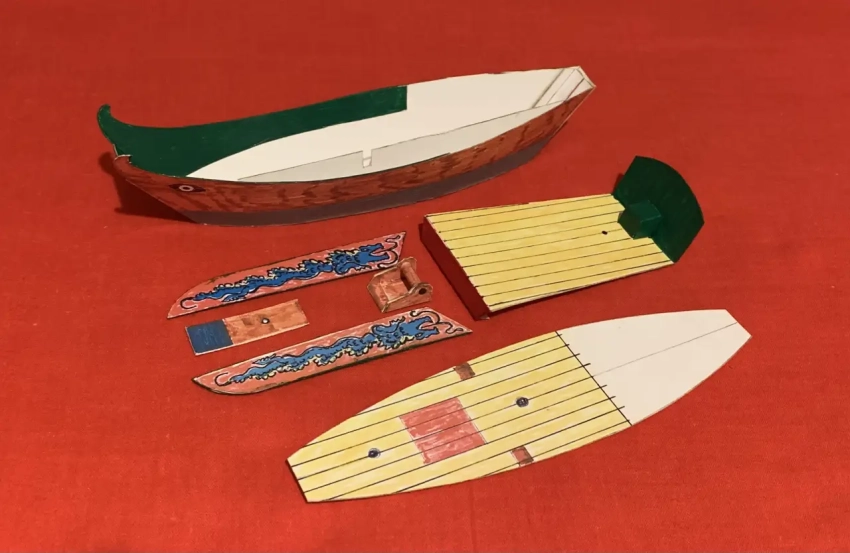 После этого в корпус вклеивается палуба: сначала передняя палуба 6, затем ее задняя часть 13, на которую с обратной стороны приклеивается деталь 14. Детали 11 и 12 наклеиваются соответственно слева и справа. Красный фон, на котором нарисован голубой дракон, можно подкрасить фломастером, а вот все остальные части корпуса, кроме разве что палубы, красятся акриловыми красками. Ватерлиния – тонкая (1 мм) полоска чёрной бумаги.