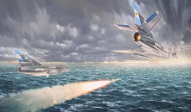 Между тем пара аргентинских штурмовиков «Супер Этандар» уже была в воздухе. Самолёты вели капитан Аугусто Бедакаррац и лейтенант Армандо Майора. Самолёты шли с подвесными топливными баками и несли по одной ракете «Экзосет». Аргентинцы соблюдали режим радиомолчания и двигались на высоте 1500 тысячи метров на экономическом режиме двигателей со скоростью 400 узлов. На расстоянии 150 миль от базы у пары штурмовиков состоялось рандеву с танкером КС-130. Наведение на цель осуществлялось самолётом «Нептун». В 280 милях от английской оперативной группы «Супер Этандары» начали снижаться для атаки, в конце концов выйдя на высоту 15 метров над волнами. Самолёты шли под лучами британских РЛС, но на дистанции в 45 миль сделали «горку», поднявшись на 36 метров, и включили бортовые РЛС «Агава», чтобы выбрать цель для удара. В этот момент они были обнаружены англичанами.
