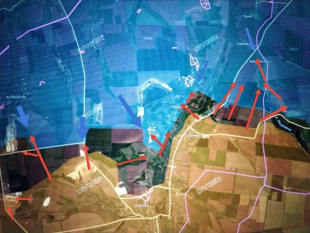 Юго-западнее продолжаются бои за Торецкое. Российские штурмовые группы атакуют села с южной и северной сторон, часть северной территории была занята на днях. Кроме того, подразделения продвинулись из Артёмовки (Софиевки) в район местного ДК и достигли опорного пункта на склоне высоты севернее села.