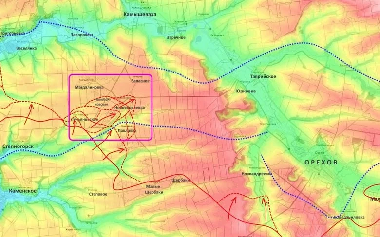 После этого, по его словам, ВСУ придется опираться дальше на линию реки Конка, населённые пункты Речное, Веселянка, Запорожец, Камышеваха, Заречное, а затем на Юрковку и Орехов.