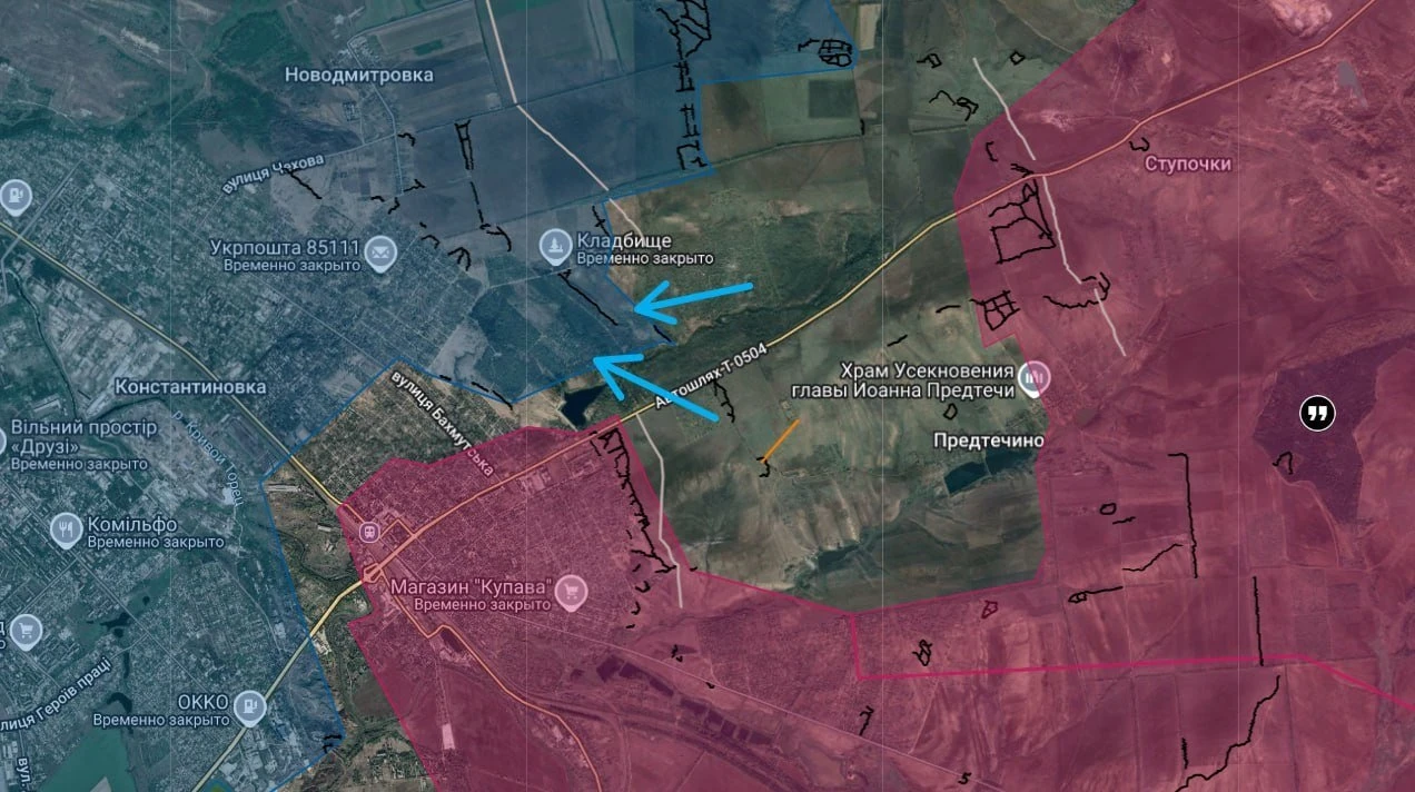 В Константиновке российские штурмовики все активнее просачиваются в центральные кварталы города, ведя бои за каждое здание. Противник начал частичный отвод основных сил с участков западнее Предтечино, однако сохраняет точечное присутствие малых групп для сдерживания нашего продвижения.