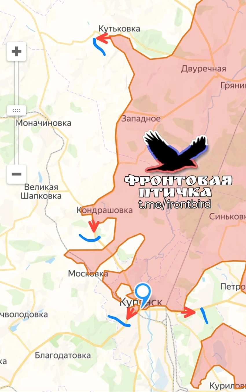 В самом Купянске ситуация остается стабильно напряжённой. Продолжаются позиционные бои, противник пытается перебрасывать резервы в Купянск-Узловой через замерзший Оскол. Российские части методично пресекают эти попытки огнем артиллерии, удерживая огневой контроль над переправами. Общая конфигурация фронта на этом участке свидетельствует о подготовке к более масштабному охвату группировки противника.