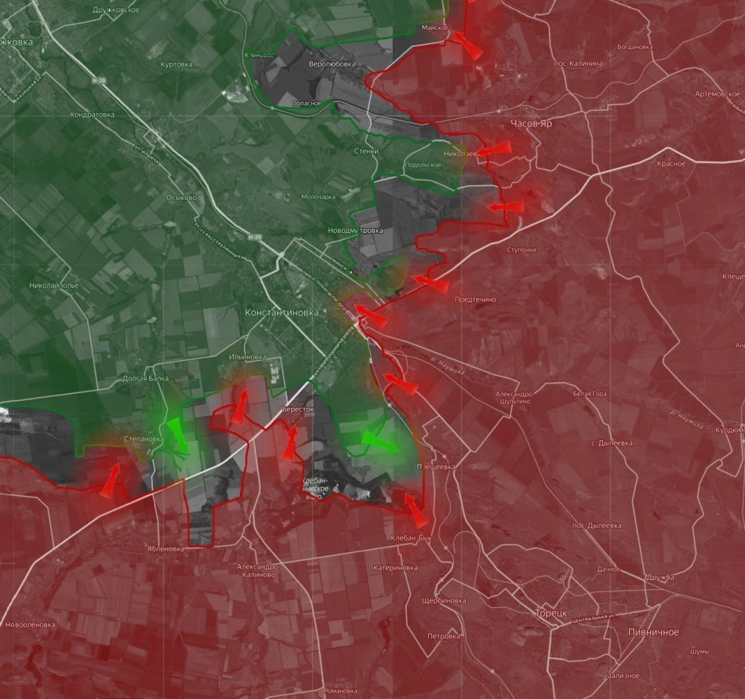 В Константиновке продолжаются бои в юго-восточной части застройки, к северу от Клебан-Быкского водохранилища идёт зачистка местности. Поступают подтверждения об успехе ВС России в Торецком (8 км до Дружковки). Сохранение вклинения в оборону противника формирует условия для охвата агломерации с юго-запада.