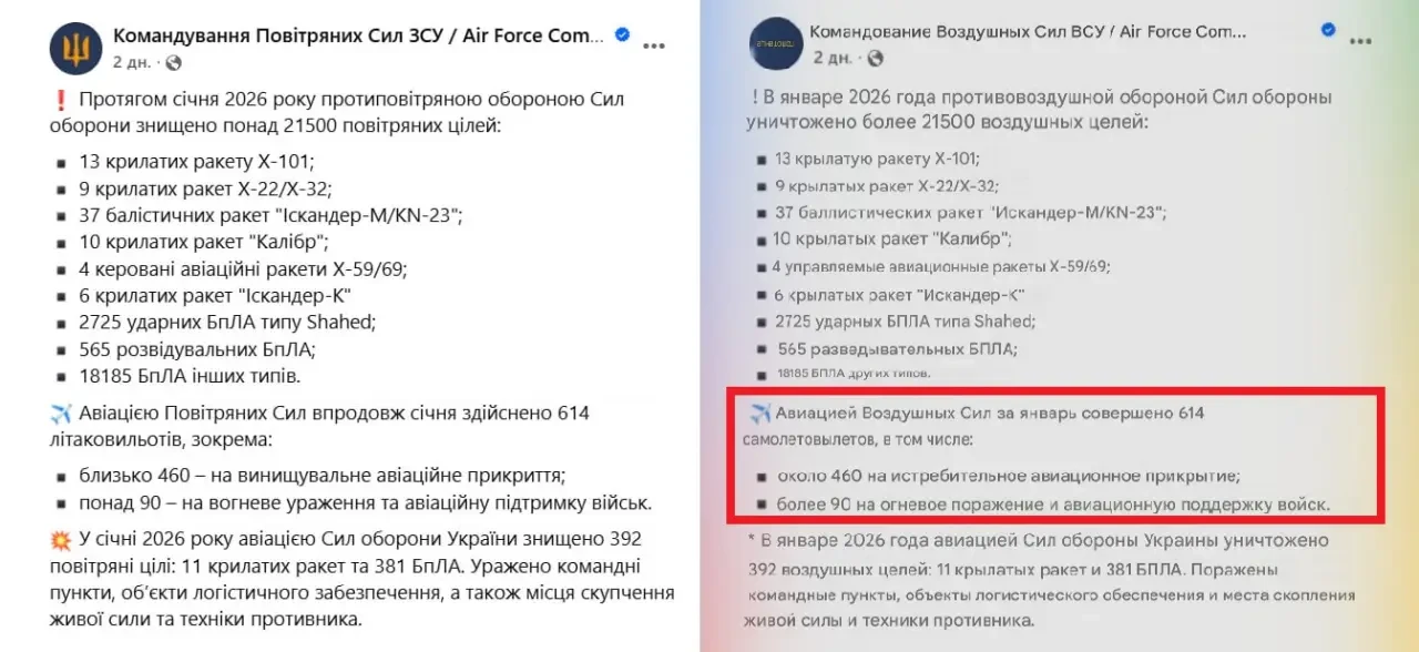 Данные о статистике боевых вылетов самолётов украинских ВВС в январе 2026 года, взятые с ресурсов противника
