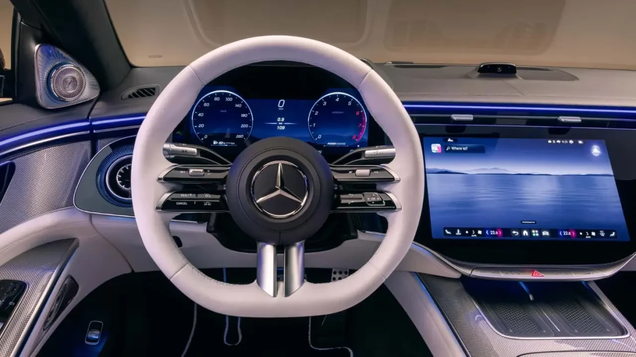 В отличие от Hyperscreen в EQS, где даже приборная панель размещена под общей стеклянной поверхностью, здесь 12,3-дюймовый дисплей водителя (при желании можно заказать с трёхмерным изображением) по-прежнему выполнен как отдельный элемент. При этом 14,4-дюймовый центральный экран и 12,3-дюймовый дисплей пассажира на переднем сидении объединены единой стеклянной панелью, формируя визуально цельное технологичное пространство.
