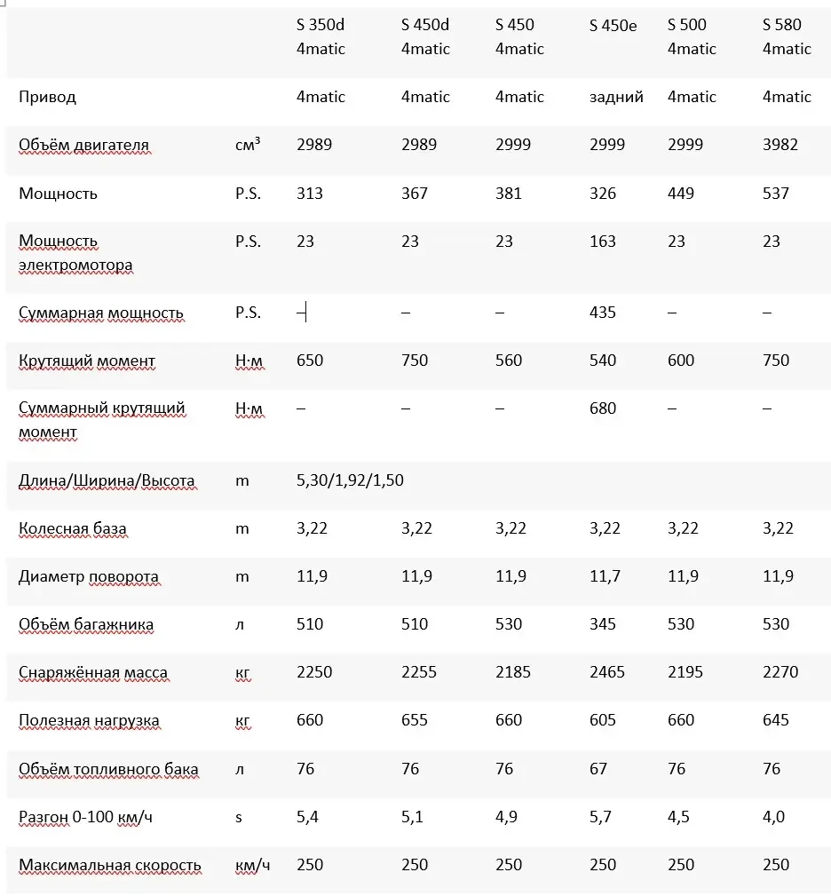 Рядные шестицилиндровые бензиновые моторы S 450 и S 500 (M256 Evo) получили более мощный электрический бустер-турбонагнетатель (система eBooster/48 V mild hybrid), который в нижнем диапазоне оборотов помогает турбине и практически полностью устраняет турбояму, особенно при обгонах или спонтанном ускорении.