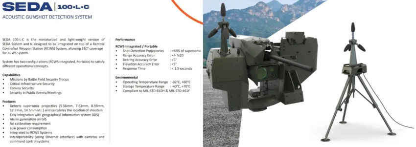 SEDA 100 использует продвинутые акустические датчики для обнаружения с вероятностью более 95% звука выстрела и ударной волны от сверхзвукового снаряда во время его полёта. При этом она способна засечь и огонь из пехотного оружия различных калибров.
