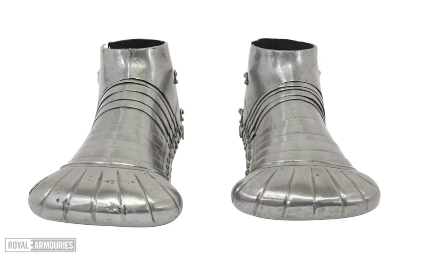Наплечники из перекрывающих друг друга пластин стали отличительной особенностью мастерской в Гринвиче. Левый (если смотреть спереди) наплечник состоял из восьми полос, а вот правый почему-то из семи. Юбка состоит из девяти полос, как спереди, так и сзади. Петли на ней находятся слева, пряжки ремней справа. Латы для ног могли быть изготовлены в Италии или во Фландрии. Их попросту взяли от какого-то старого доспеха.