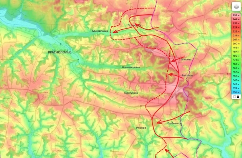 В ходе последних боев российские военные заняли село Покровка, которое находится совсем рядом с Краснопольем. Подоляка сообщает, что сейчас бойцы стараются пройти дальше - в сторону Михайловки и Новодмитровки.