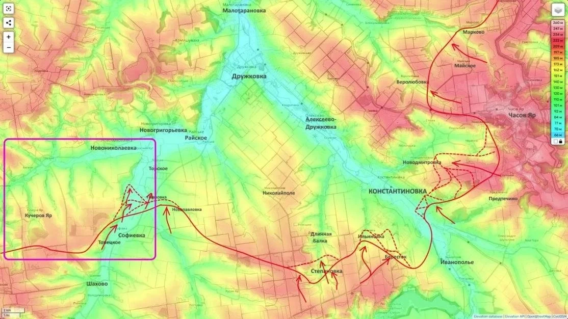 На Константиновском направлении подтверждён повторный заход российских штурмовых групп в юго-западную часть Константиновки. Закрепление идет в районе высотной застройки через Бересток и Ильиновку. Теперь штурм города ведется с двух направлений - с юго-востока и юго-запада, что критически усложняет положение гарнизона ВСУ.