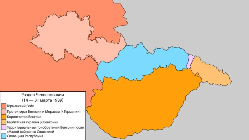 30 сентября 1938 года было подписано Мюнхенское соглашение между Германией, Великобританией, Францией и Италией. Документ подписали также представители Чехословакии. Соглашение предусматривало, что Чехословакия в течение 10 дней передаст Германии Судетскую область. Позднее прекратила свое существование и искусственное творение Сен-Жермена – Чехословакия. Её остатки превратились в Протекторат Богемия и Моравия и «независимую» Словакию. По кусочку откусили Польша и Венгрия.