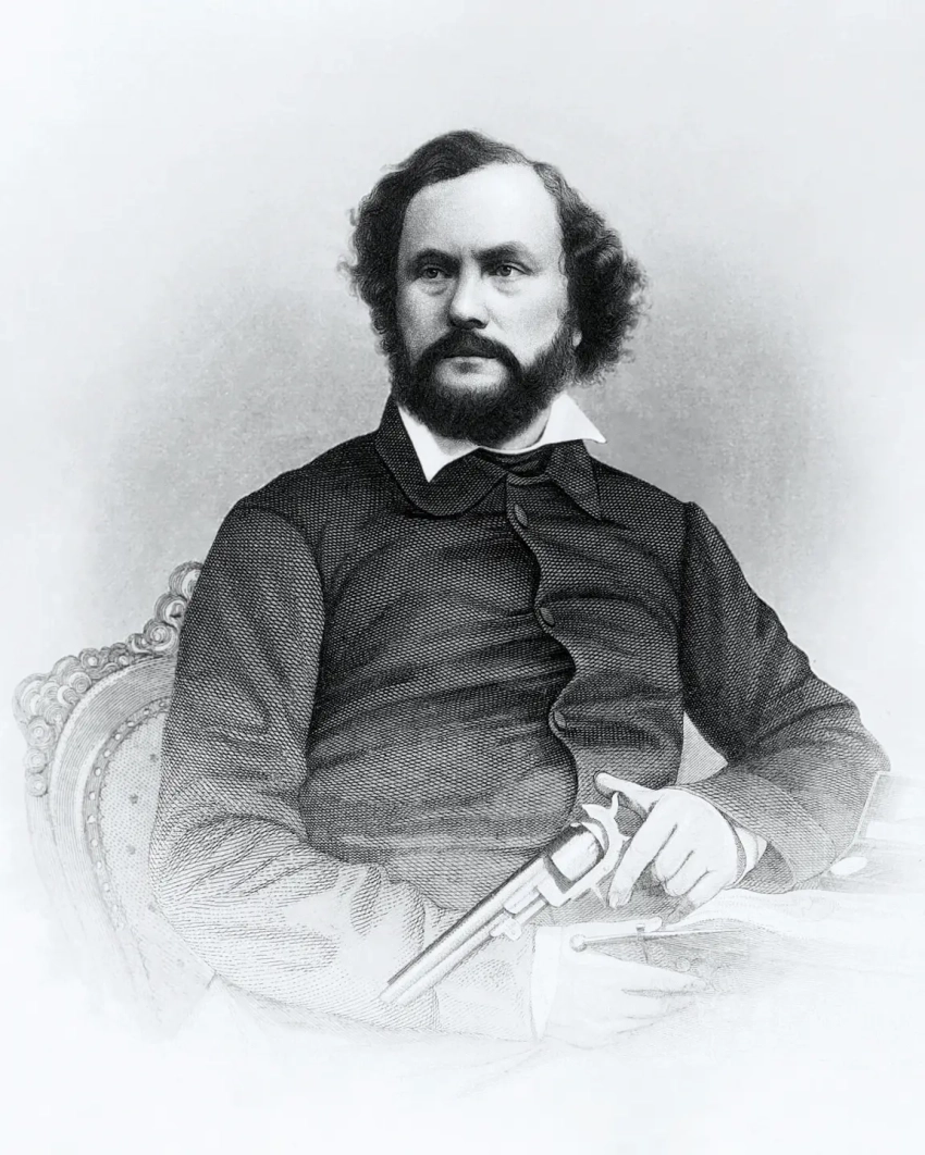 Каноничный портрет изобретателя, гравировка по стальной пластине, с дагерротипа за авторством Филиппа Граффа. В руках у Кольта револьвер модели 1851 года