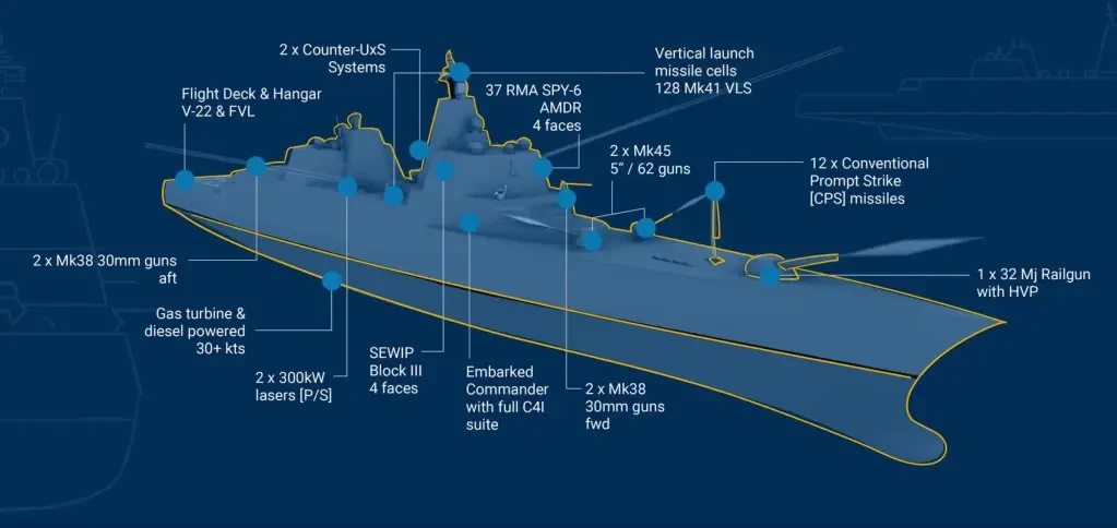 В перспективных проектах ведутся работы по оптимизации конструкции, испытываются боевые лазеры, и антенные посты поднимаются на большую высоту. Но общий масштаб остается прежним — около 10 тыс. тонн стандартного водоизмещения.