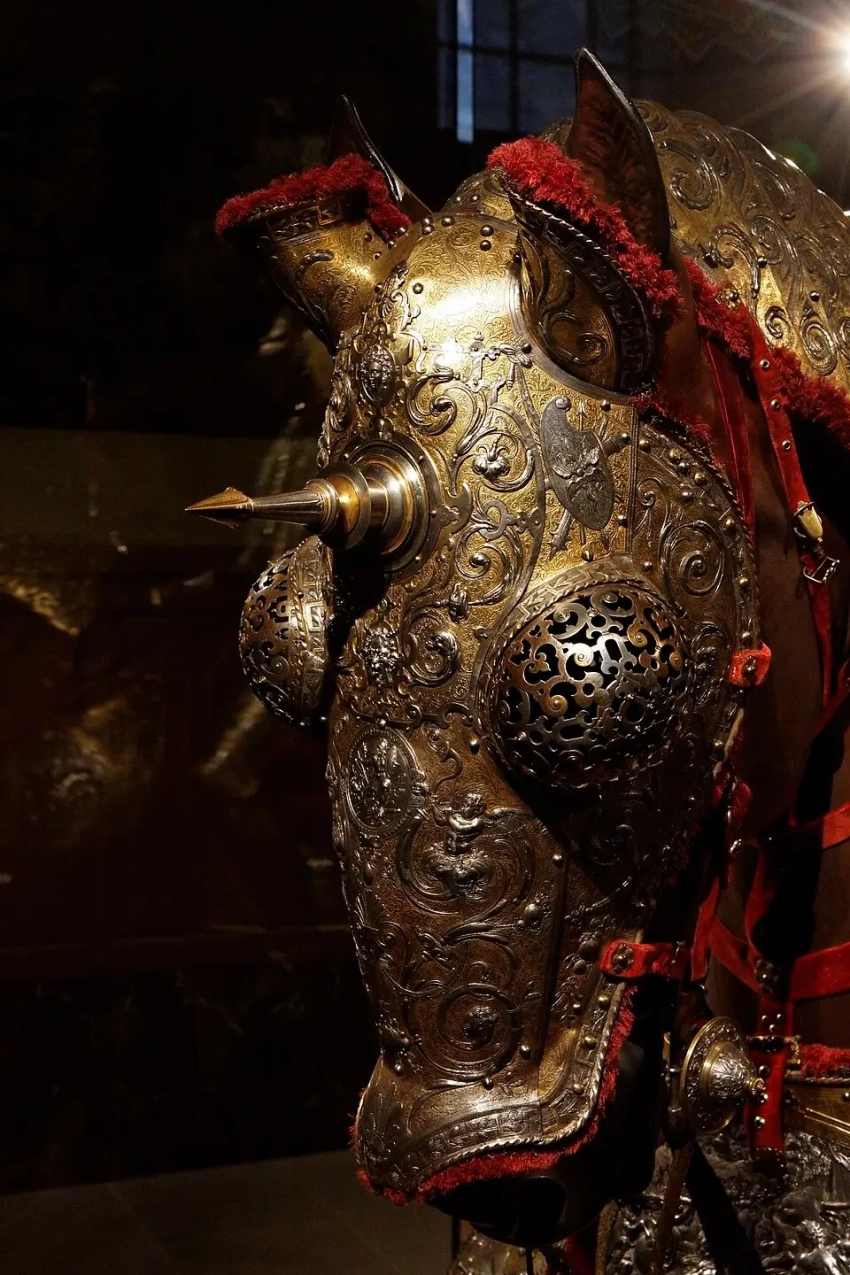 Самыми ранними доспехами, украшенными чеканкой, которые сохранились до нашего времени, — это конские латы императора Фридриха III, изготовленные в 1477 году. На их передней пластине можно видеть чеканное изображение полуфигуры ангела с распростертыми крыльями, а на задней – большого императорского орла по обеим его сторонам. Потом более чем тридцать лет ничего похожего не создавалось (или просто до нас не дошло), но вот уже со второго десятилетия XVI в. украшенных чеканкой доспехов становится все больше и больше: например, доспехи, хранящиеся в лондонском Тауэре, а также множество доспехов, созданных после 1530 года, находящихся в других музеях.