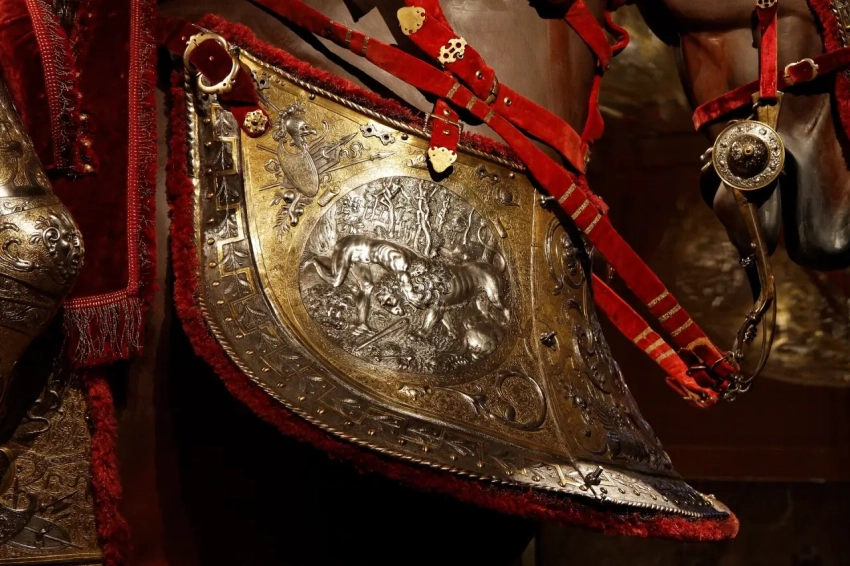 Доспехи эти представляют собой полный гарнитур, включающий и сам доспех для всадника, и абсолютно полный бард, то есть доспехи для коня. По сути дела, это даже и не доспех вовсе, а своего рода произведение доспешного ремесла и искусства: «чистейшей прелести чистейший образец» (А. С. Пушкин). Причем, несмотря на самое пышное оформление, какое только можно себе представить, отделаны они с таким вкусом, что в них нет ничего лишнего. Как об этом уже здесь сообщалось, доспех короля Эрика получил название «Доспеха Геракла», а все потому, что основными мотивами чеканных изображений на нем стали 12 подвигов Геракла, а также события из истории Троянской войны и плавания аргонавтов. Причем всю поверхность гарнитура украшает орнамент, и к тому же все его украшения либо позолочены, либо посеребрены. И очень важной деталью являются парные фигурки Пегаса, выбитые на забрале. Это не просто так, не просто фантазия мастера – это еще и «говорящий» символ красноречия владельца доспеха, в котором Эрик по задумке должен был предстать перед королевой-девственницей Елизаветой Английской.