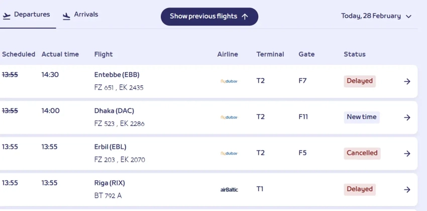 Онлайн-табло аэропорта Дубая информирует о том, что большинство рейсов отменено или перенесено. Среди таких рейсы в Энтеббе (Уганда), Ригу (Латвия), Дакку (Бангладеш), Эрбиль (Ирак), Баку (Азербайджан).