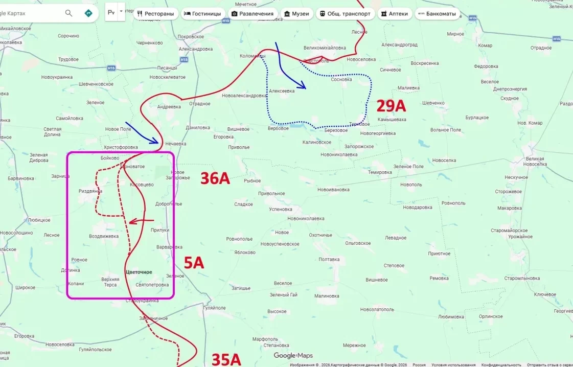 Продолжаются атаки из района Гуляйполя, фиксируется продвижение западнее Железнодорожного. В районе Верхней Тёрсы идут крайне интенсивные боестолкновения. Одновременно в полосе 36-й армии уточнена обстановка по Рождественскому: под контролем российских сил находится восточная часть населённого пункта, бои продолжаются.