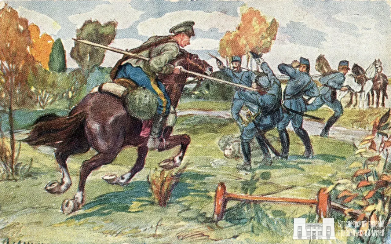 Открытка из фондов КККМ. Владимиров И. Атака сибирских казаков. 1914 г.
