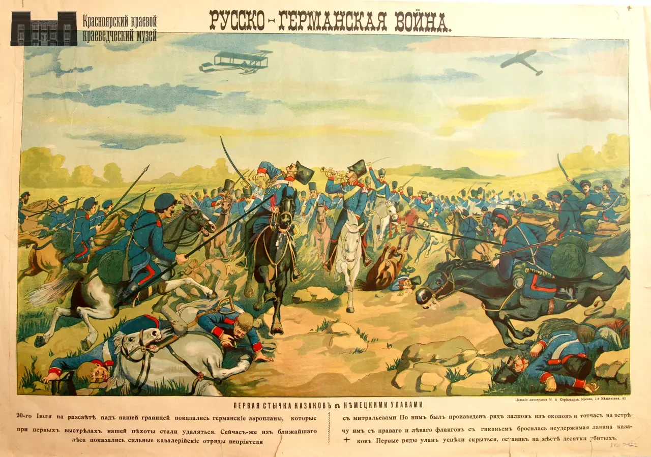 Плакат из фондов КККМ «Русско-германская война. Первая стычка казаков с немецкими уланами». 1914 г.
