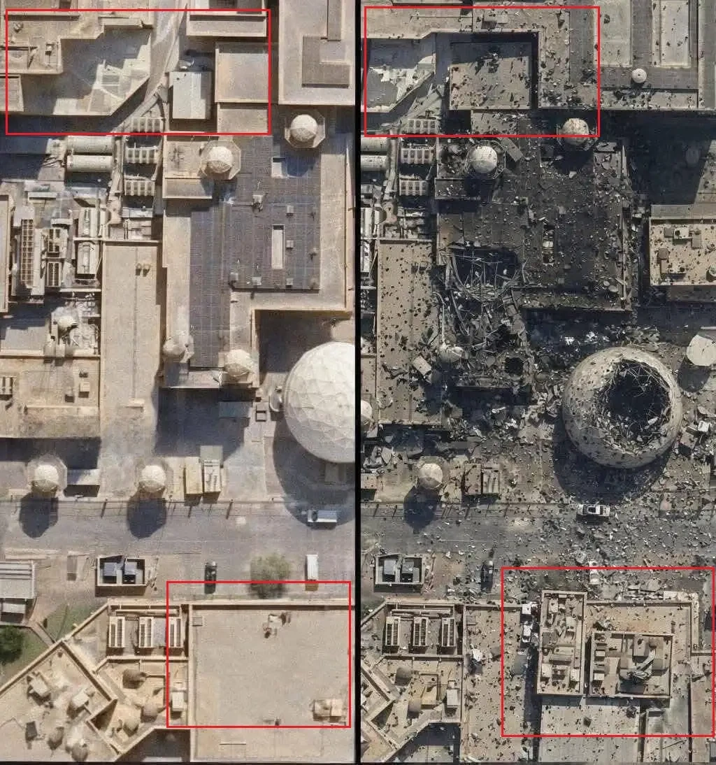 В сети стали распространяться «спутниковые снимки» якобы последствий удара по американскому радару раннего предупреждения в Катаре, на которых он уничтожен, однако этот снимок оказался сгенерированным искусственным интеллектом (ИИ). Это достаточно просто распознать, внимательно посмотрев на предоставленные «снимки» – контуры строений не совпадают, машина на фото «до» и «после» находится практически на том же месте, что и была (что маловероятно).