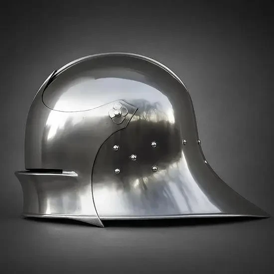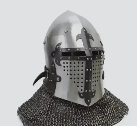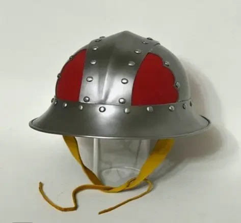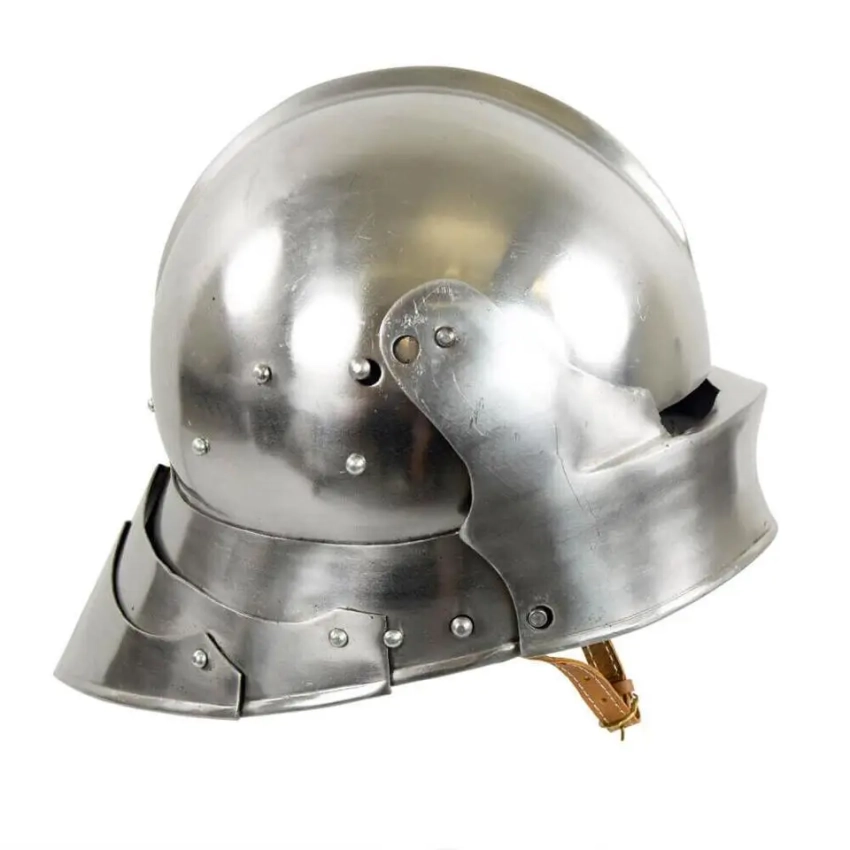 Ну, это что-то уж совсем примитивное. Зато недорого и потом на этот шлем можно прикрепить некие украшения, вырезанные из липовых ламелей и к тому же раскрасить в гербовые цвета. Потом надеваешь гербовое сюрко, под него стеганку и кольчужные совсем короткие нарукавники и… вот ты и рыцарь, ведь никто не не будет проверять – одета на тебе вся кольчуга, или же из под сюрко торчат лишь только рукава?!