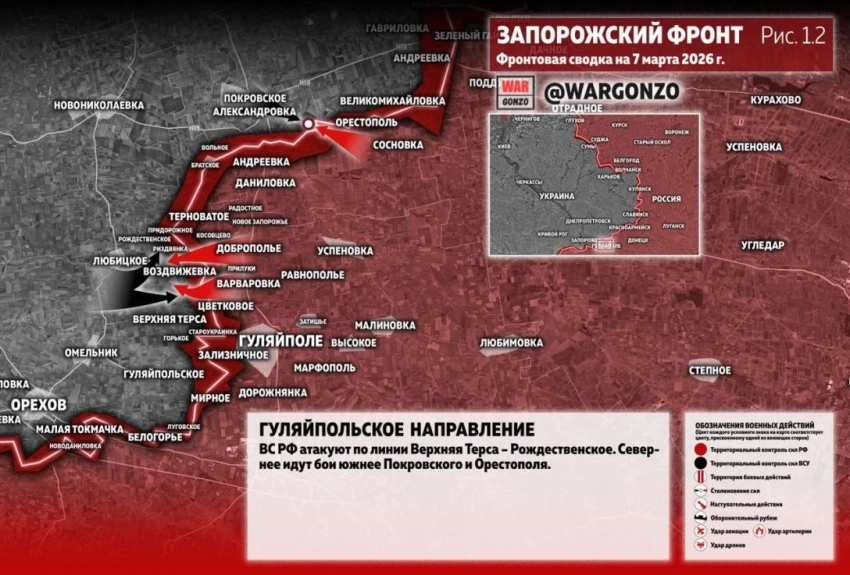 Параллельно ВС РФ пытаются выйти на рубеж Верхняя Терса - Гуляйпольское для того, чтобы обойти Ореховский узел обороны украинской армии с востока и северо-востока. Ранее стало известно об освобождении Криничного на этом участке фронта.